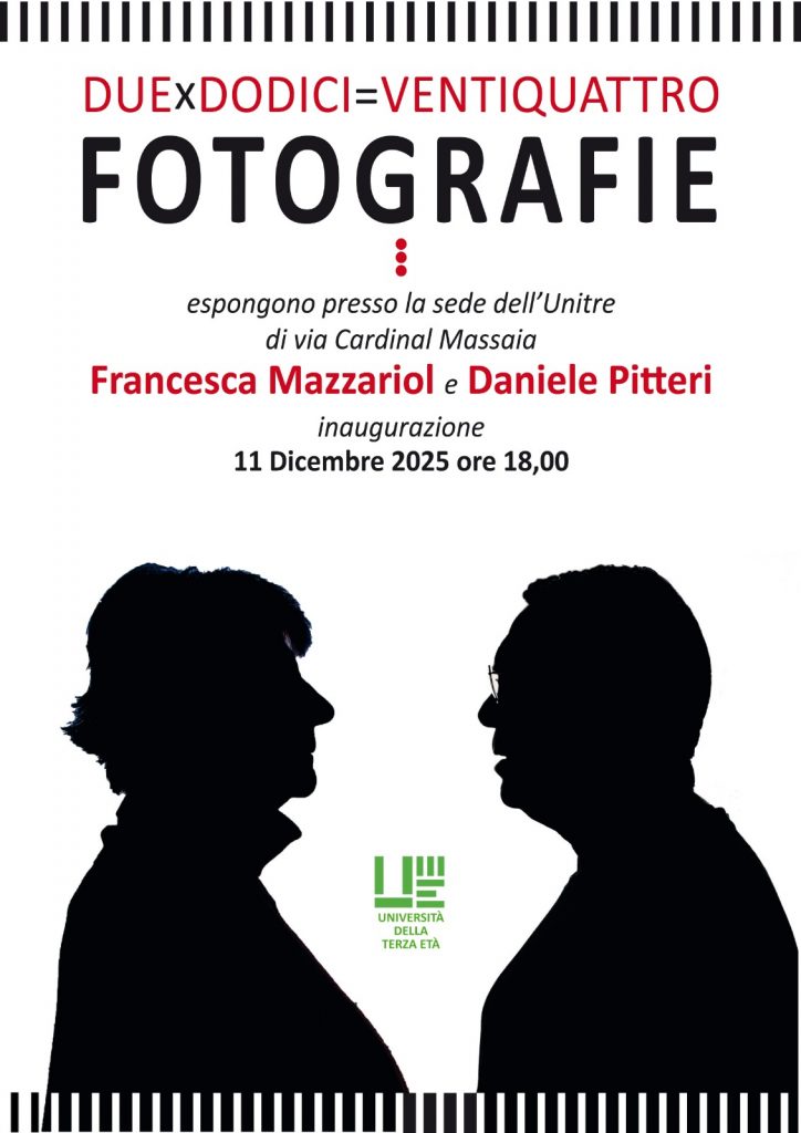 Da ieri sera in sede Unitre è stata allestita, dopo un anno circa, la mostra fotografica 2×12=24, la rassegna che vede due corsisti di quel laboratorio – Francesca Mazzariol e Daniele Pitteri – presentare 12 fotografia ciascuno, a tema libero. La rassegna non ha cedenze programmate o calendari pianificati; nasce spontaneamente e, come iniziativa, ha sempre trovato grande attenzione da parte dell’Unitre che mette a disposizione la lunga parete delle Sede di Via Cardinal Massaia. Da oggi è visitabile da tutti durante gli orari di apertura della segreteria.