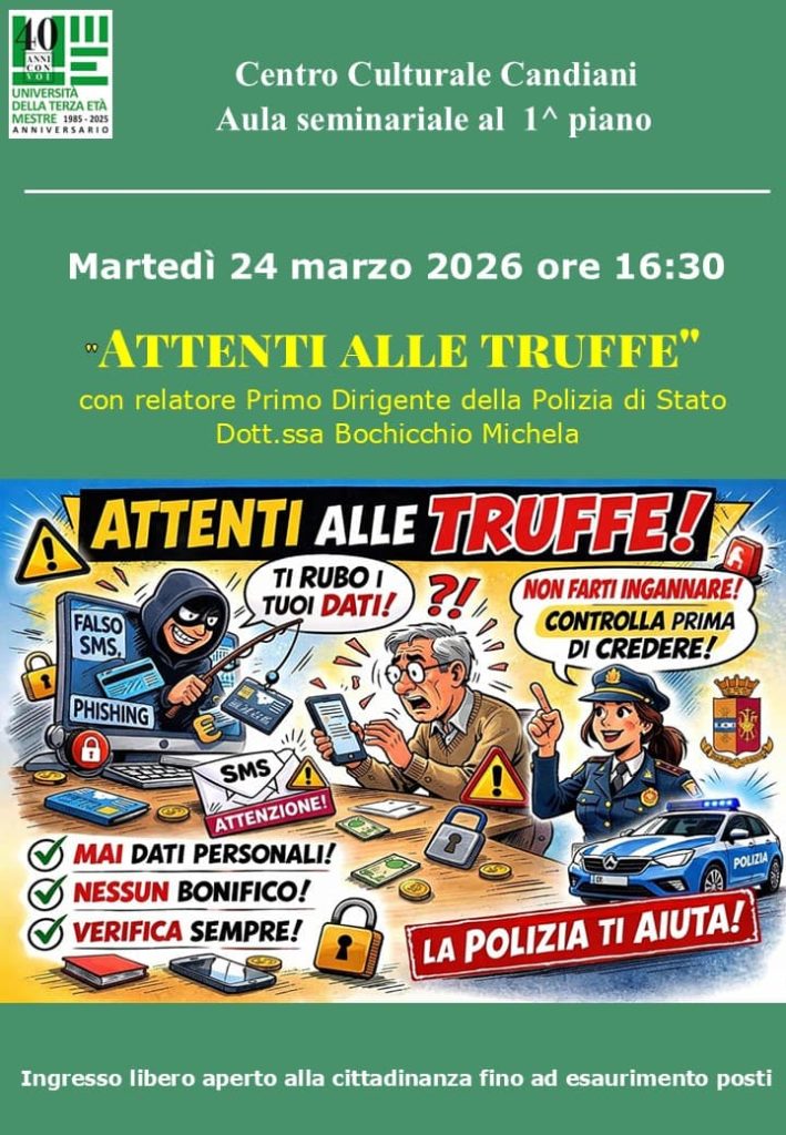Il prossimo Martedì 24 Marzo la dott.ssa Michela Bochicchio, Primo Dirigente della Polizia di Stato, presenterà un argomento di estrema importanza che coinvolge un numero sempre maggiore di persone di ogni età, quello delle truffe online ma anche di persona.