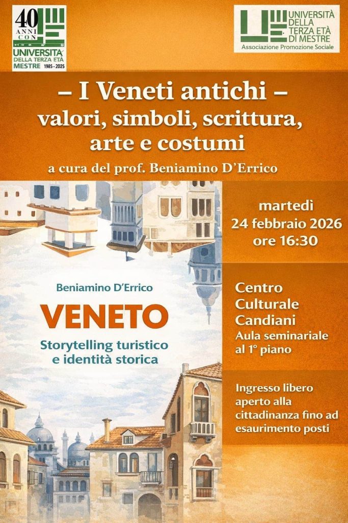 La conferenza “I Veneti antichi: valori, simboli, scrittura, arte e costumi” si terrà il prossimo Martedì 24 Febbraio alle ore 16.30 presso l’Aula Seminariale al primo piano del Centro Culturale Candiani.
