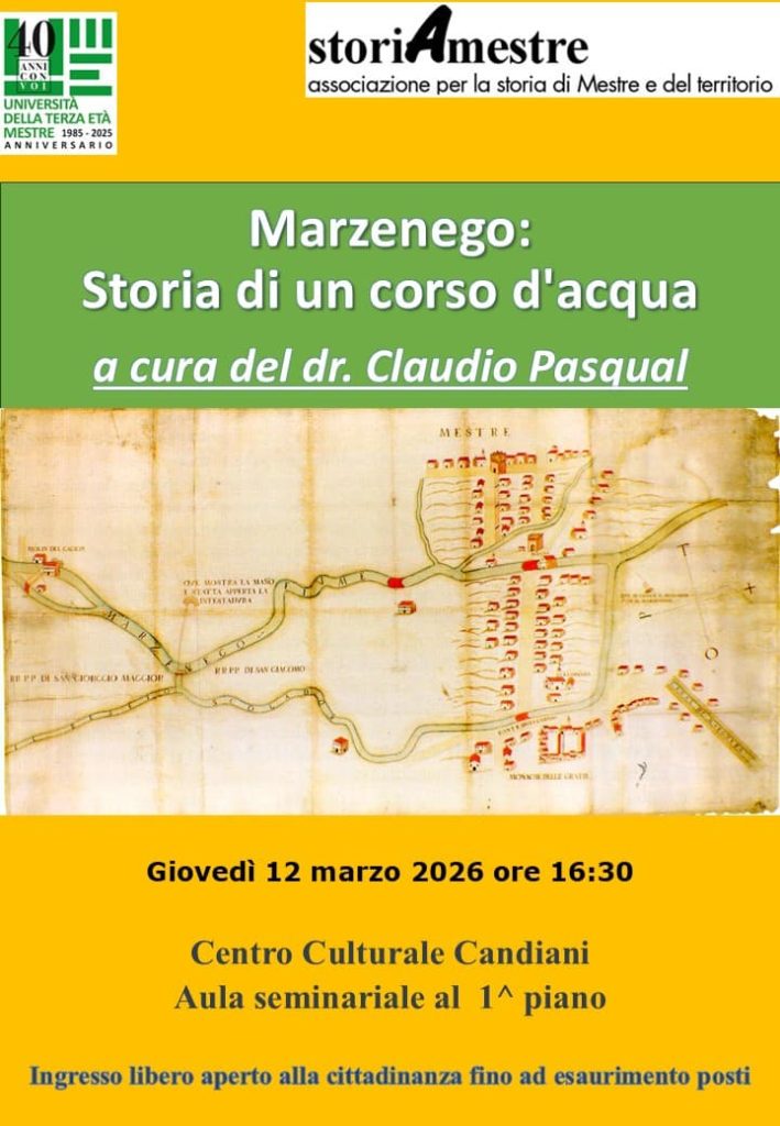 La conferenza “Il Marzenego: Storia di un corso d’acqua” è prevista per le pre 16.30 presso l’Aula Seminariale al primo piano del Centro Culturale Candiani con entrata libera.