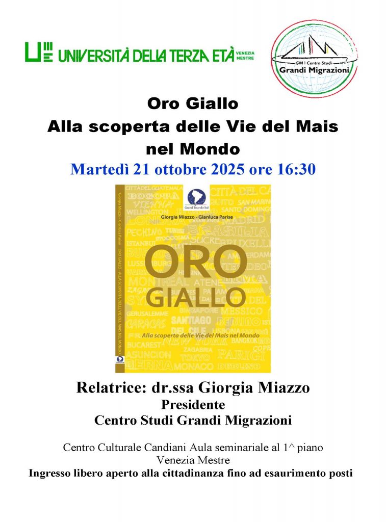 La conferenza ‘Oro Giallo – Alla scoperta delle vie del mais nel mondo‘ sarà condotta dalla presidente del Centro, la Dott.ssa Giorgia Miazzo, a partire dalle ore 16.30 presso l’aula seminariale al primo piano del Centro Culturale Candiani a Mestre.