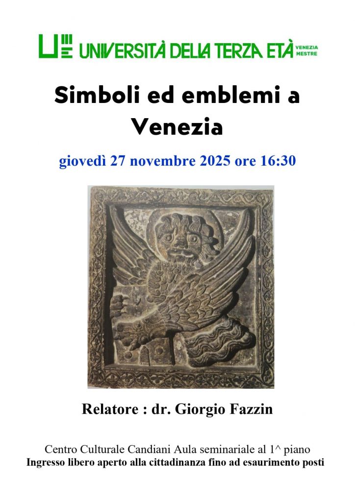 Tutta la cittadinanza è invitata a partecipare alla conferenza sul tema “Simboli ed emblemi a Venezia” tenuta dal Dr. Giorgio Fazzin il prossimo Giovedì 27 Novembre.