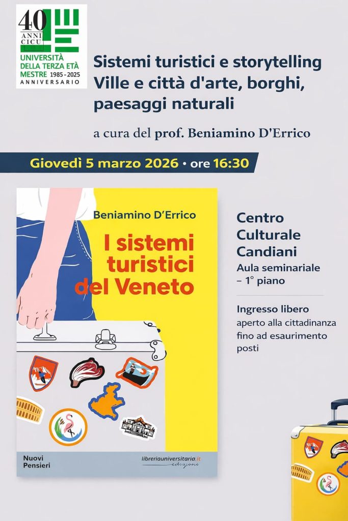 L’ultimo incontro con il prof. Beniamino d’Errico è anche il primo del mese di Marzo. L’appuntamento per la conferenza intitolata “Sistemi turistici e storytelling – Ville, borghi e città d’arte, paesaggi naturali” è per Giovedì 5 Marzo alle ore 16.30, presso l’Aula Seminariale al primo piano del Centro Culturale Candiani.