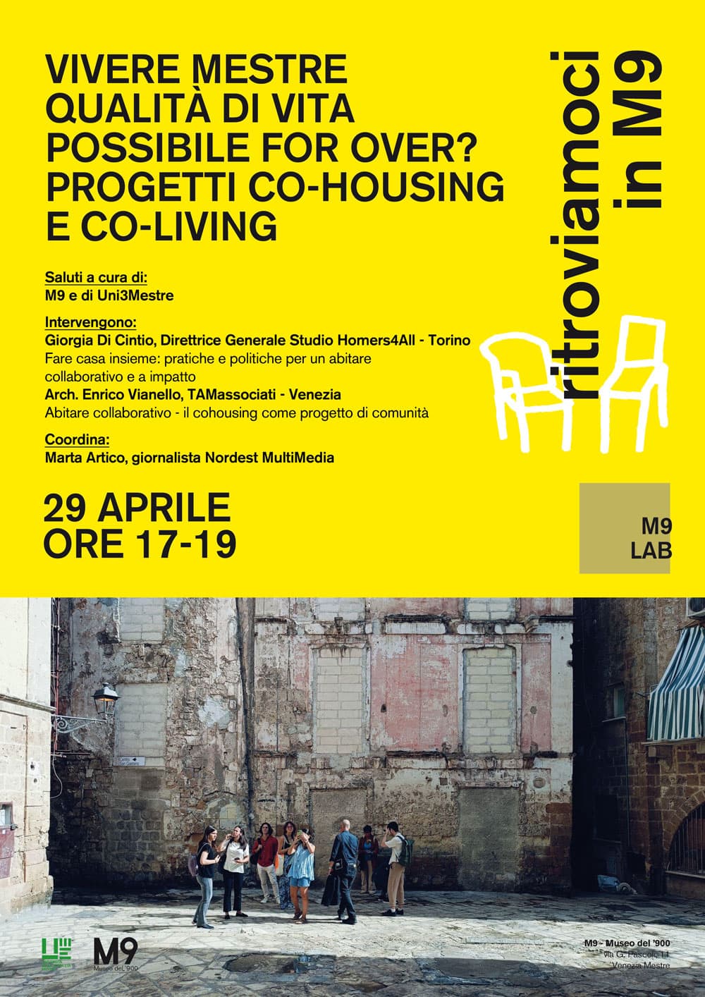 I risultati dell’indagine promossa dal bando, dal tema ‘Vivere Mestre‘ e a cui hanno partecipato i soci nell’ambito dell’osservatorio ‘Abitare Mestre for Over’ verranno presentati durante il terzo ciclo di incontri il prossimo 21 e 29 Aprile negli spazi dell’M9 Cube e M9 Lab rispettivamente, a partire dalle ore 17.