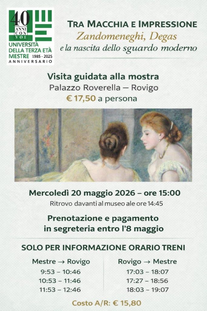Il ritrovo sarà alle ore 14.45 davanti all’entrata del museo. Nella locandina è possibile vedere gli orari consigliati dei treni andata e ritorno da Mestre.